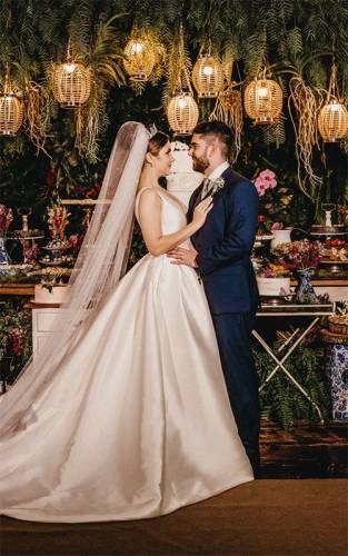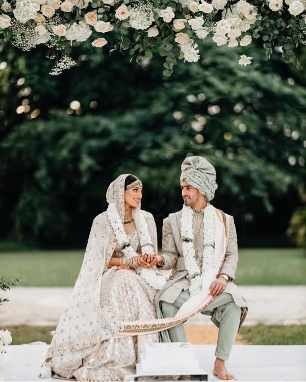 hindu wedding bride and groom celebrating wedding event with flower decorations